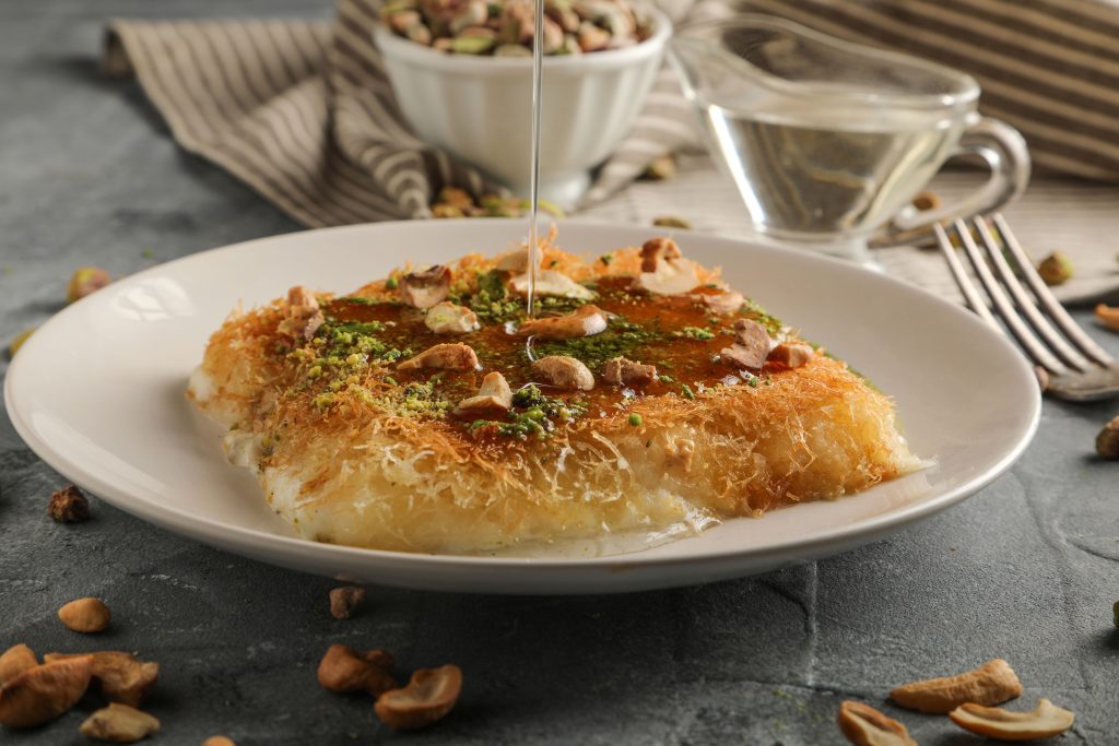 מכינים סוכר מומס מכוס מים וכוס סוכר. מוסיפים את הדבש ומצמצמים מעט על להבה חלשה. יוצקים מעל הכנאפה את הסירופ של הסוכר והדבש. מפזרים מעל פיסטוקים שבורים וקשיו קלוי שבור ומגישים.