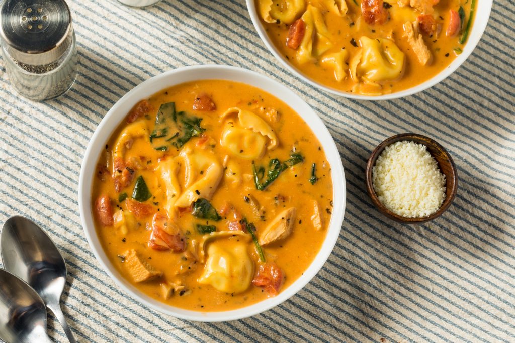 מה תגידו על ארוחה שלמה בסיר אחד? מרק עגבניות ופלפלים קרמי עם כיסוני רביולי שצפים להם בנחת בפנים?